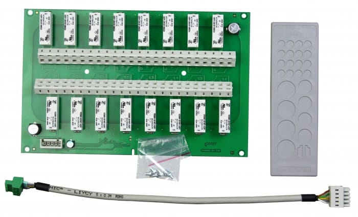 Montáž desky relé se provádí do těla ústředny. Modul výstupních relé. Obsahuje 16 síťových relé, maximální napětí 50V AC/75V DC s přepínacím kontaktem, z nichž každé může být spínáno na základě vzniku jednoho nebo více alarmů na různých vstupních kanálech podle nastavení pomocí obslužného programu.