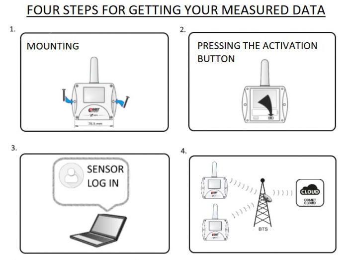 Naměřené hodnoty jsou odesílány v nastavitelném časovém intervalu (10 min až 24 h) rádiovým přenosem v síti Sigfox do internetového úložiště COMET Cloud, odkud je uživatel může prohlížet pomocí osobního počítače nebo mobilního zařízení.