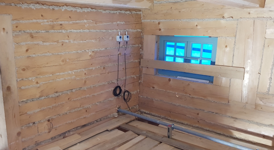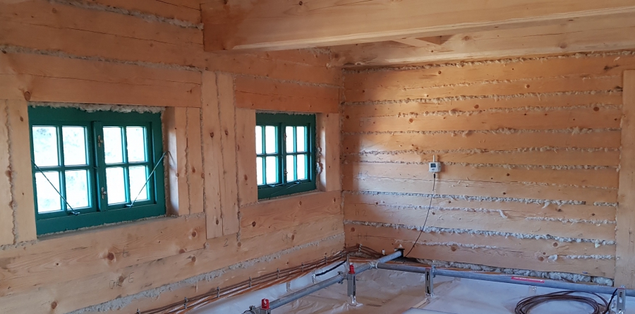 Z toho důvodu bylo naprojektováno vložení folie mezi srub a dřevěné obložení vnitřních stěn.