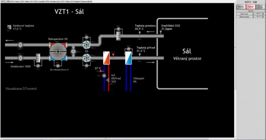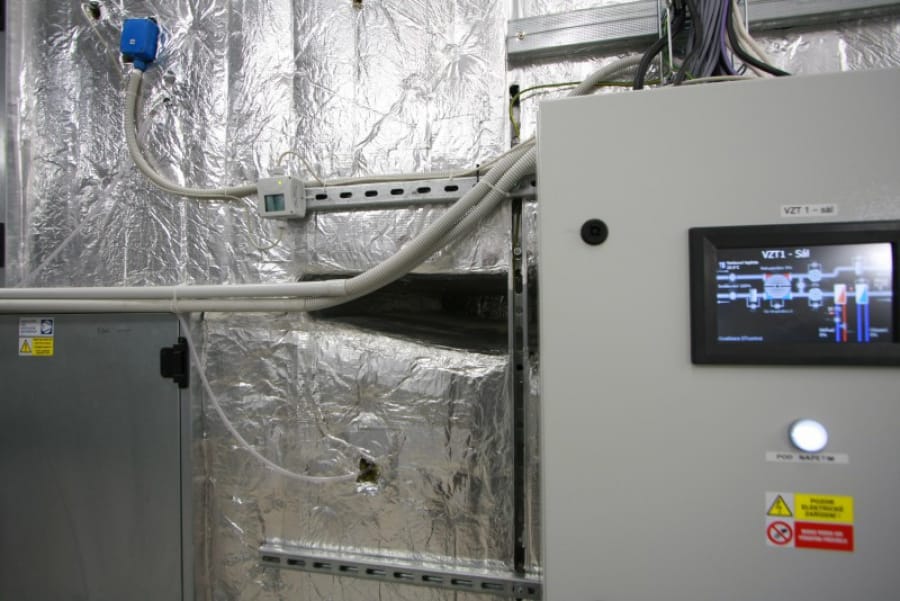 Výměnu vzduchu v nově zrekonstruovaném Kulturním informačním centru Zašová zajišťuje celkem šest vzduchotechnických jednotek, které jsou funkčně rozděleny podle využití a dispozic objektu. Všechny VZT jednotky, včetně 450 kW plynové kotelny, řídí systém měření a regulace DTcontrol. Obsluha zadává provozní parametry z centrálního dispečerského pracoviště uvnitř budovy, nebo pomocí vzdálené správy.