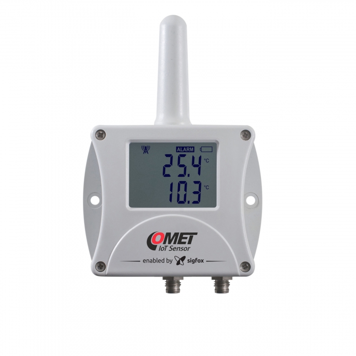Přístroj může sledovat až 2 alarmové meze měřené veličiny. Překročení těchto mezí je indikováno zasláním mimořádné zprávy. COMET Cloud tuto alarmovou zprávu předá prostřednictvím e-mailu zvolenému uživateli. Přístroj je vhodný pro aplikace, které tolerují zpoždění informací doručovaných v síti Sigfox (max. 10 min).